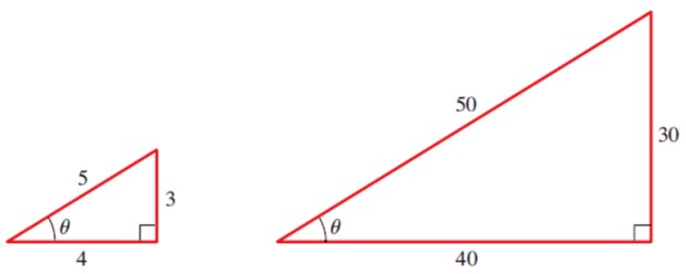 Por ejemplo, calculemos las razones trigonométricas del ángulo θ en los siguientes triángulos: